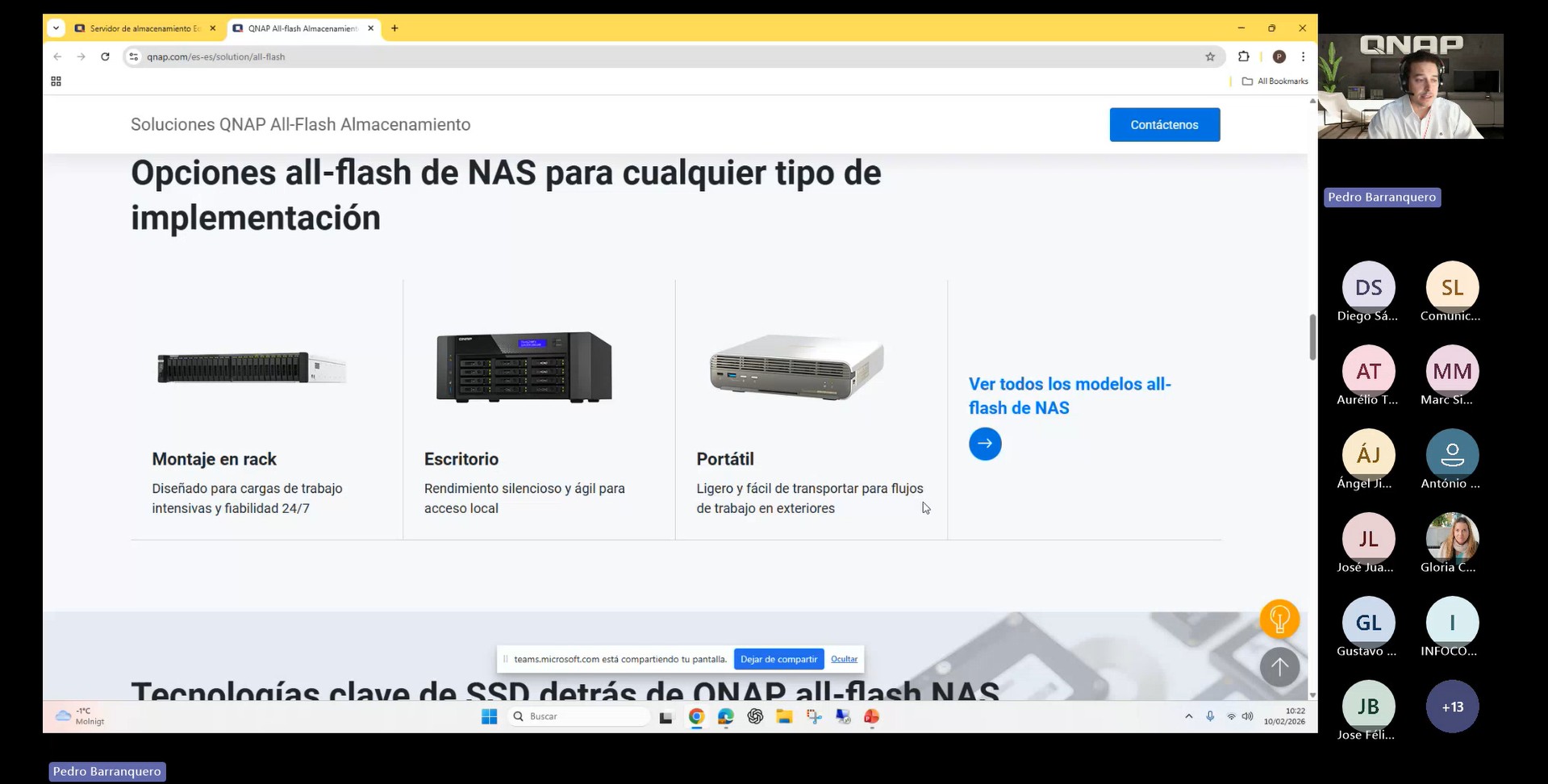 A lo largo de la formación se analizó el portfolio completo de soluciones a través de la web oficial de QNAP, comparando distintos modelos de NAS en función de escenarios de uso y requisitos de rendimiento. Asimismo, se abordaron soluciones de expansión de almacenamiento de hasta 60 bahías, switches gestionables, herramientas como la calculadora RAID, procesos de migración entre NAS QNAP y datos reales de rendimiento.