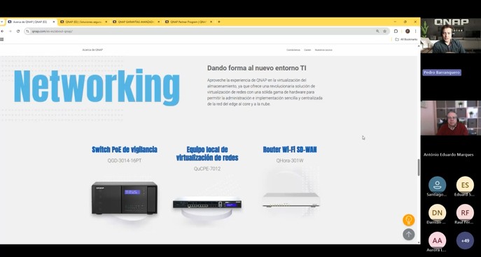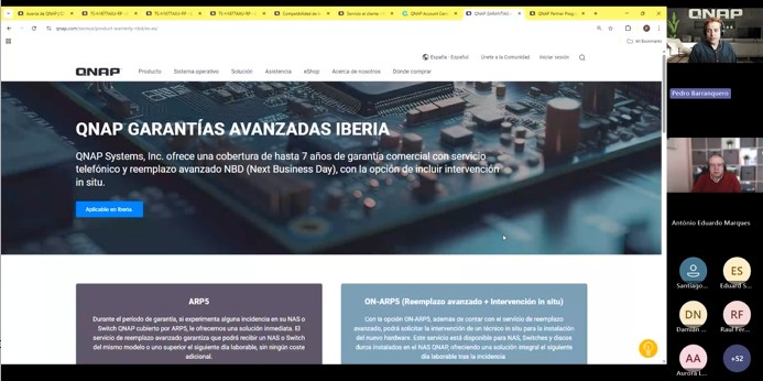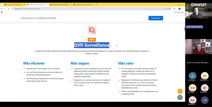 La sesión también incluyó un repaso de soluciones complementarias como QVR Surveillance para videovigilancia, QSS Pro para entornos de switching, opciones de ampliación del NAS, compatibilidad de dispositivos, ecosistema de aplicaciones, capacidades de inteligencia artificial y soporte técnico oficial de QNAP.